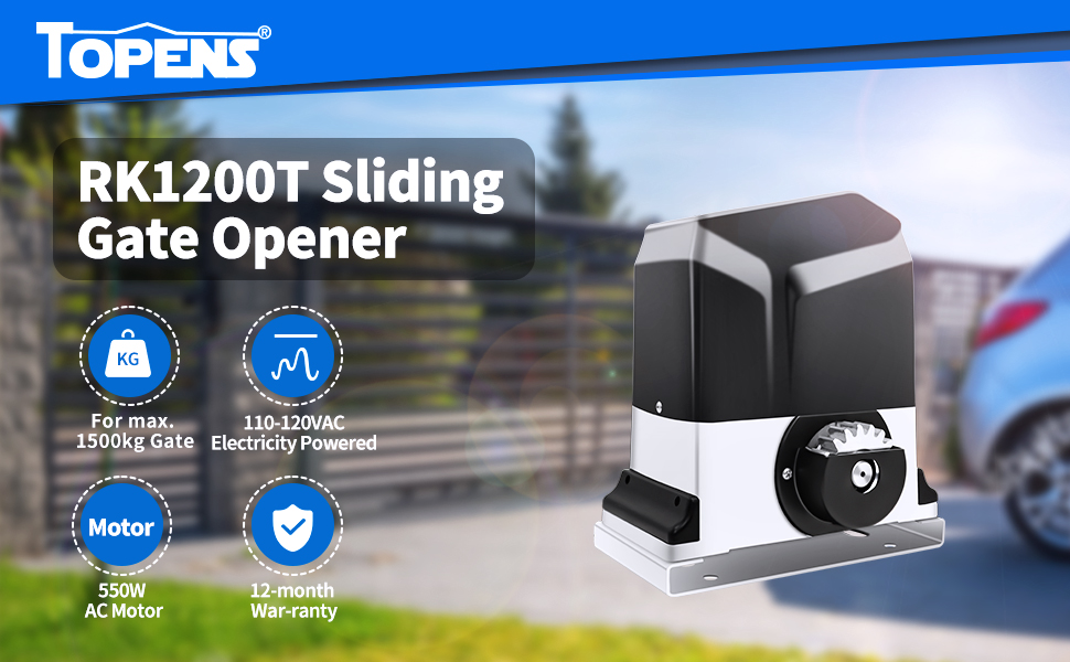Choose TOPENS for over 25 years of gate automation expertise. Our RK1200T sliding gate opener features a powerful 3/4 HP 550W AC motor that effortlessly handles gates up to 3400 lbs and 40 ft long. This ultra-quiet automatic gate opener opens and closes your driveway gate smoothly, enhancing your daily convenience and security for a safer, smarter home.