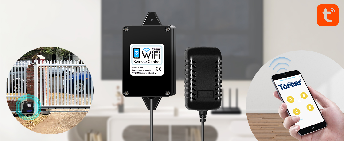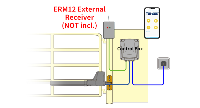 Perfect for all TOPENS gate openers right out of the box. For third-party systems, connect via our ERM12 External Receiver (sold separately) – it accepts "Normally Open Dry Contact" signals and runs on 9-24VDC from the board or external power. Note: TC196 works solely with gate openers, not other smart home devices. Get reliable WiFi remote gate control tailored to your needs.
