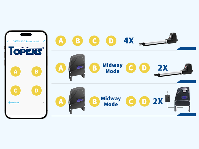 Pair the TOPENS TC196 to your gate opener in seconds. Its four-button interface handles various setups within range: - Up to four swing gate openers. - One sliding gate motor plus two swing gate openers. - One sliding gate plus two more slidings (add an ERM12 to each board and use buttons C/D for everyday use).