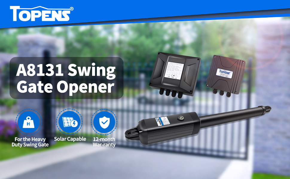 Tired of wrestling with heavy gates every day? The TOPENS A8131 single swing gate opener solves that hassle. With over 25 years in gate automation, we deliver safe, smart, and reliable systems that last. This heavy-duty opener handles single swing gates up to 880 lbs or 18 ft long. Its ultra-quiet 24V 80W DC motor opens and closes automatically—saving you time and effort while making life easier for your family.